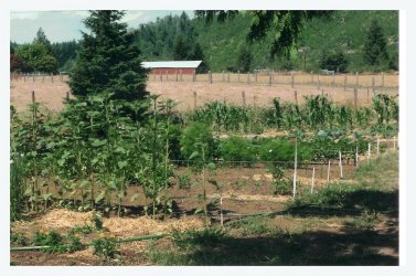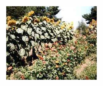 (left) with sunflowers; amaranth growing